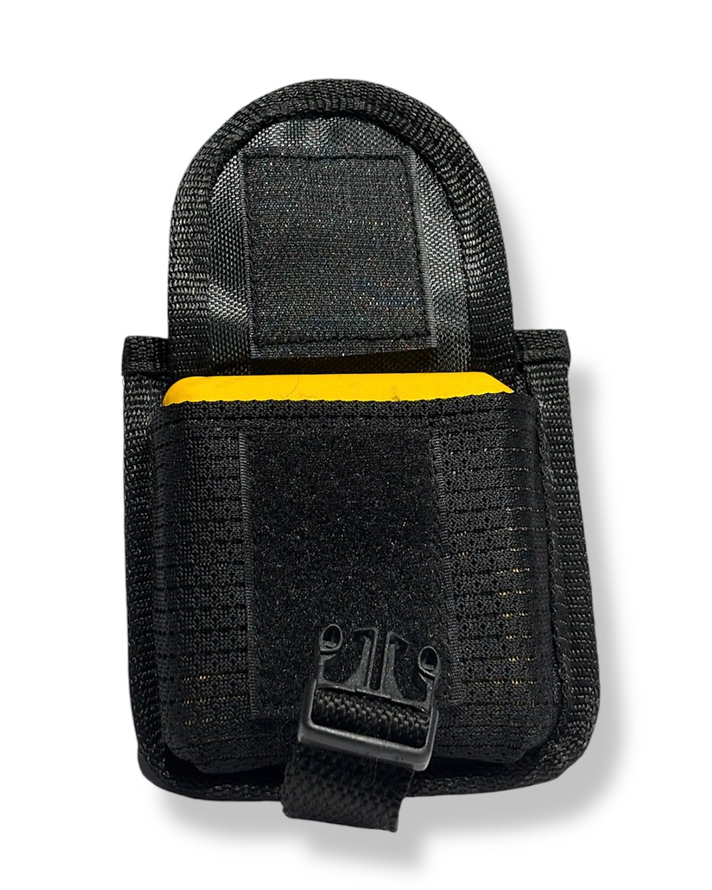 A rear adjustment strap ensures a stable and snug fit on harnesses or bottle buckles.
